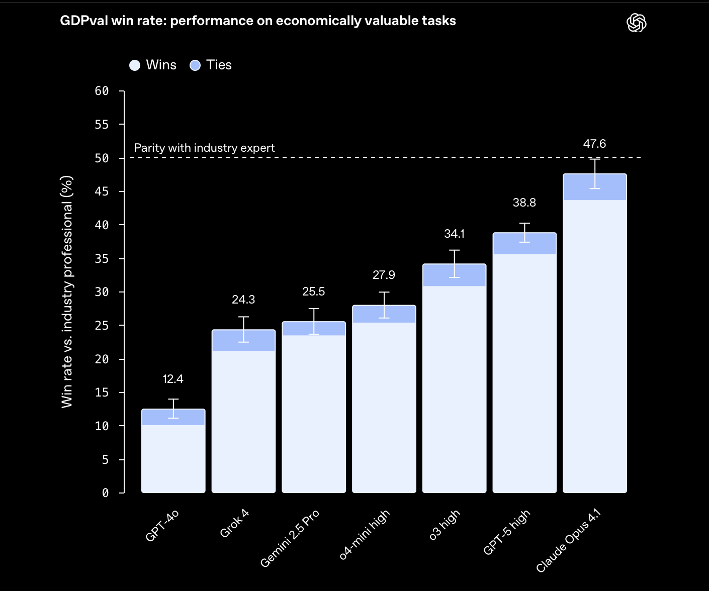 In late September, OpenAI introduced GDPval, a new evaluation system developed with industry professionals. This benchmark explicitly measures how various AI models perform on “economically useful” work across 44 occupations in the top nine sectors contributing to U.S. GDP. Based on their findings, OpenAI stated that their leading AI models can rival the work of professionals and are capable of taking on some repetitive, well-specified tasks “faster and at lower cost than experts”.