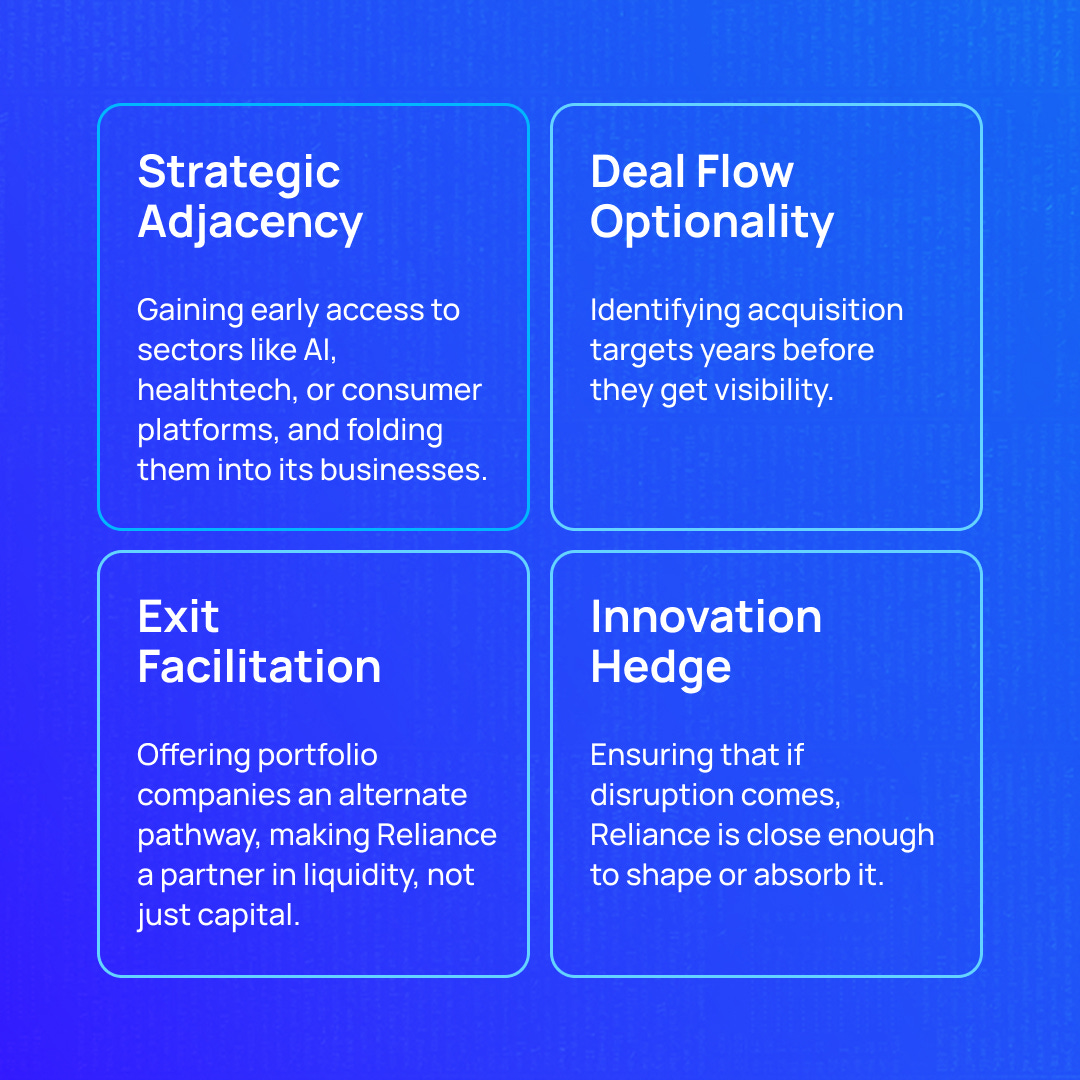 Where most LPs wait years for distributions, Reliance can act earlier. As a preferred LP, it gains visibility into themes, founders, companies and technologies. It can then selectively pull them into its own orbit - either through acquisition, partnership, or integration. In other words, it outsources discovery while retaining the right to capture the upside when it matters.